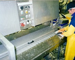 The speed of the pocket belt the in-feeder is directing fish into can be up to 450 fish/min. Proper grading and good quality of the fish is essential for reaching high capacity. No operator is needed for the in-feed, but one person is required to supervise the machine and correct failures.