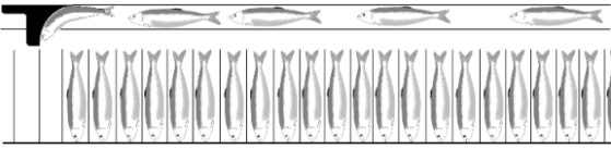 The speed of the pocket belt the in-feeder is directing fish into can be up to 450 fish/min. Proper grading and good quality of the fish is essential for reaching high capacity. No operator is needed for the in-feed, but one person is required to supervise the machine and correct failures.